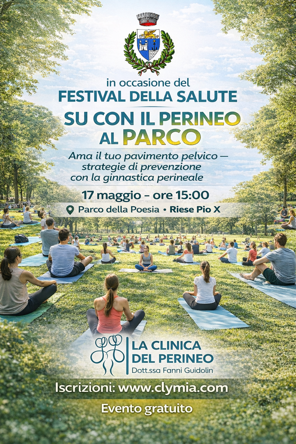 In occasione del FESTIVAL DELLA SALUTE organizzato dal Comune di Riese Pio X, alla quale parteciperanno molte associazioni, farmacie, ambulatori itineranti, professionisti medici e altri sanitari, e anche Il centro del perineo, fornendo consulenze gratuite alla cittadinanza, LA CLINICA DEL PERINEO realizzerà un super raduno di uomini e donne per praticare esercizi per il pavimento pelvico in totale libertà e leggerezza, apprendendo concetti fondamentali per la prevenzione delle disfunzioni.